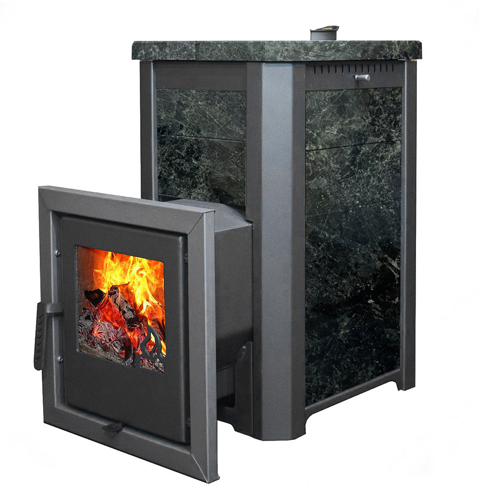 Варвара Сказка Мини – банная печь с закрытой каменкой, облицованная в кожух из камня. В конструкции данной печи имеется закрытая каменка камень в которой нагревается до 600 °С, что позволяет получить мягкий – мелкодисперсный пар. Печь облицована натуральным природным камнем, который аккумулирует тепло исходящее от печи и убирает неприятное излучение от металла, делая мягкий и приятный микроклимат в парной.