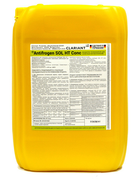 Концентрат теплоносителя для солнечных систем отопления, применяется для получения теплоносителя Antifrogen SOL HT с антифризными и ингибирующими свойствами, работающий при повышенных нагрузках.